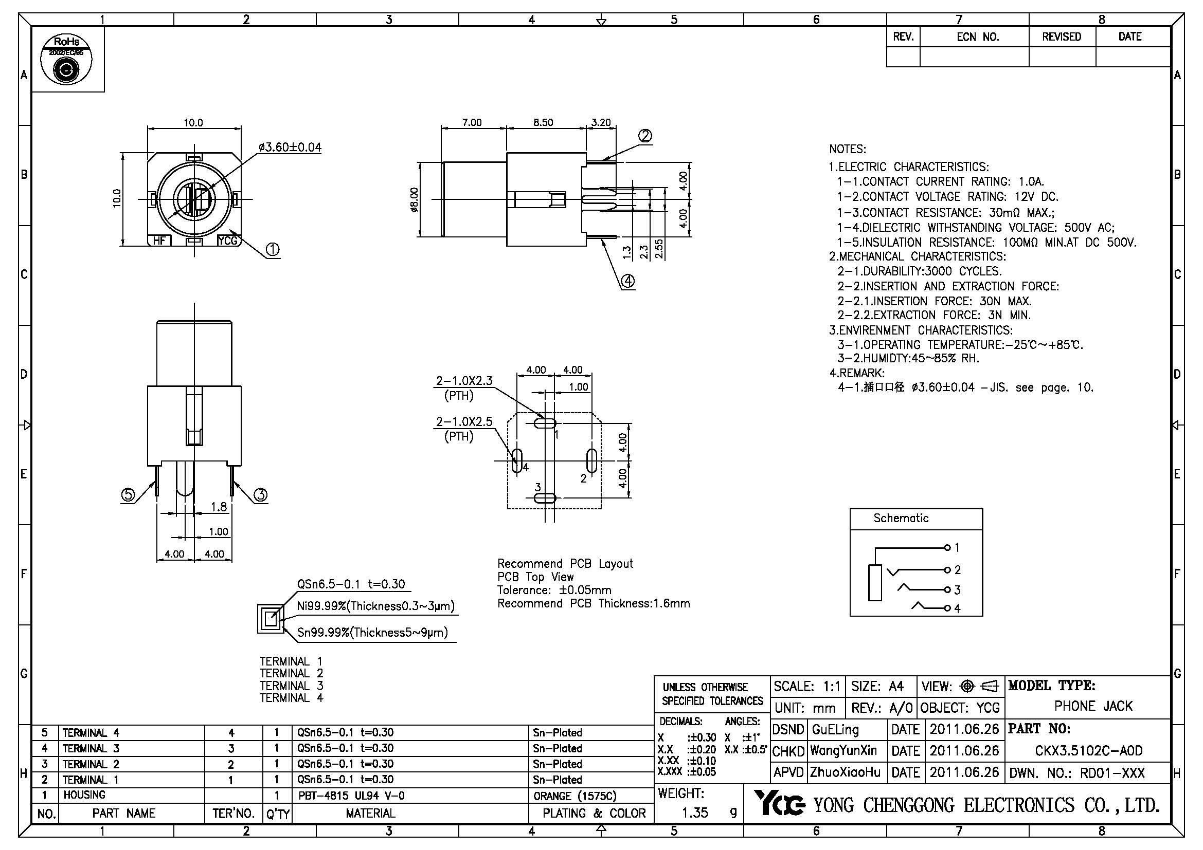PHONE JACK φ3.6mm,V/D,H8.5mm,4Poles,BLACK&ORANGE
