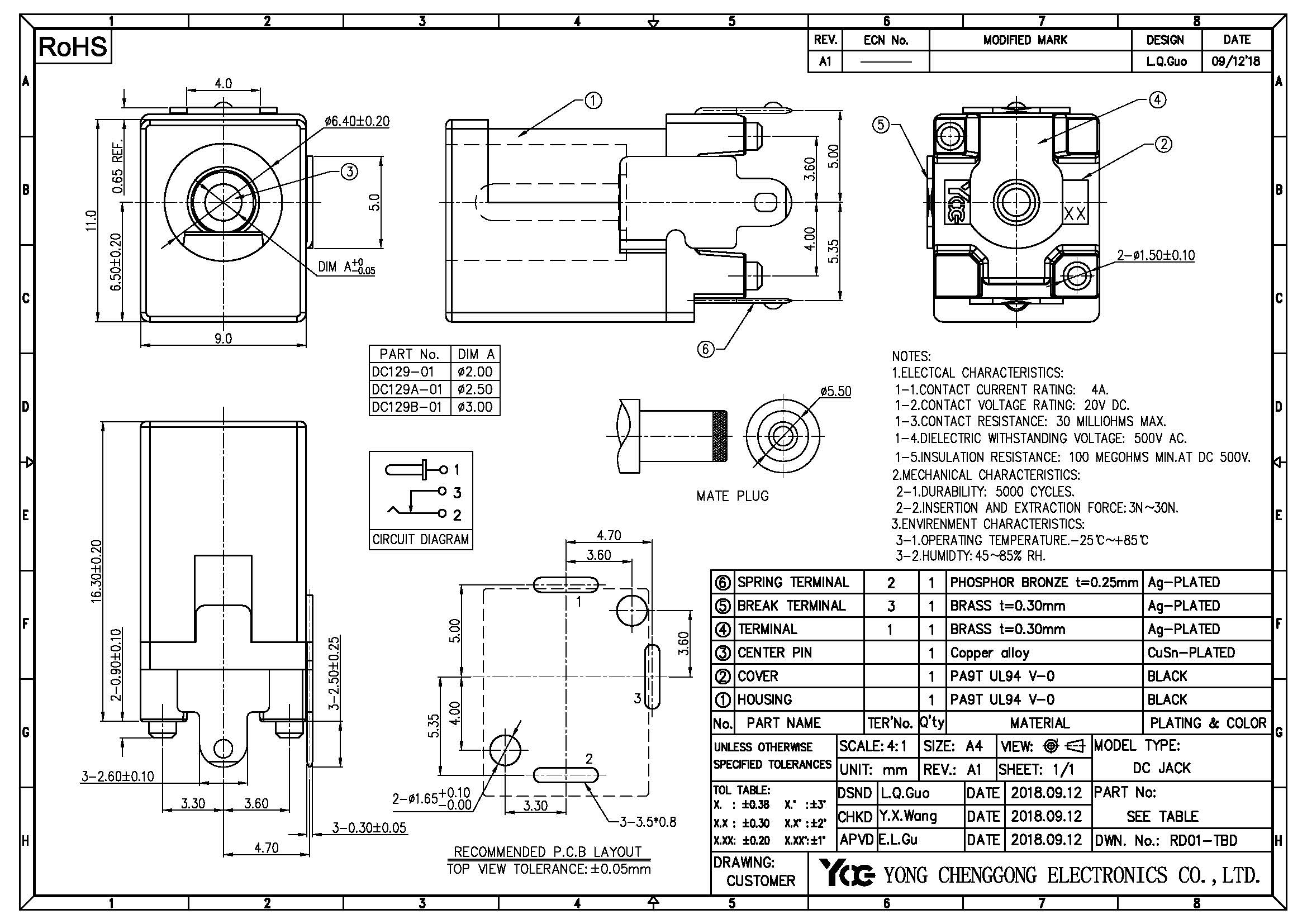 DC129 DC POWER JACK V/T DIP,φ2.00mm, φ2.50mm,φ3.00mm,H16.3mm