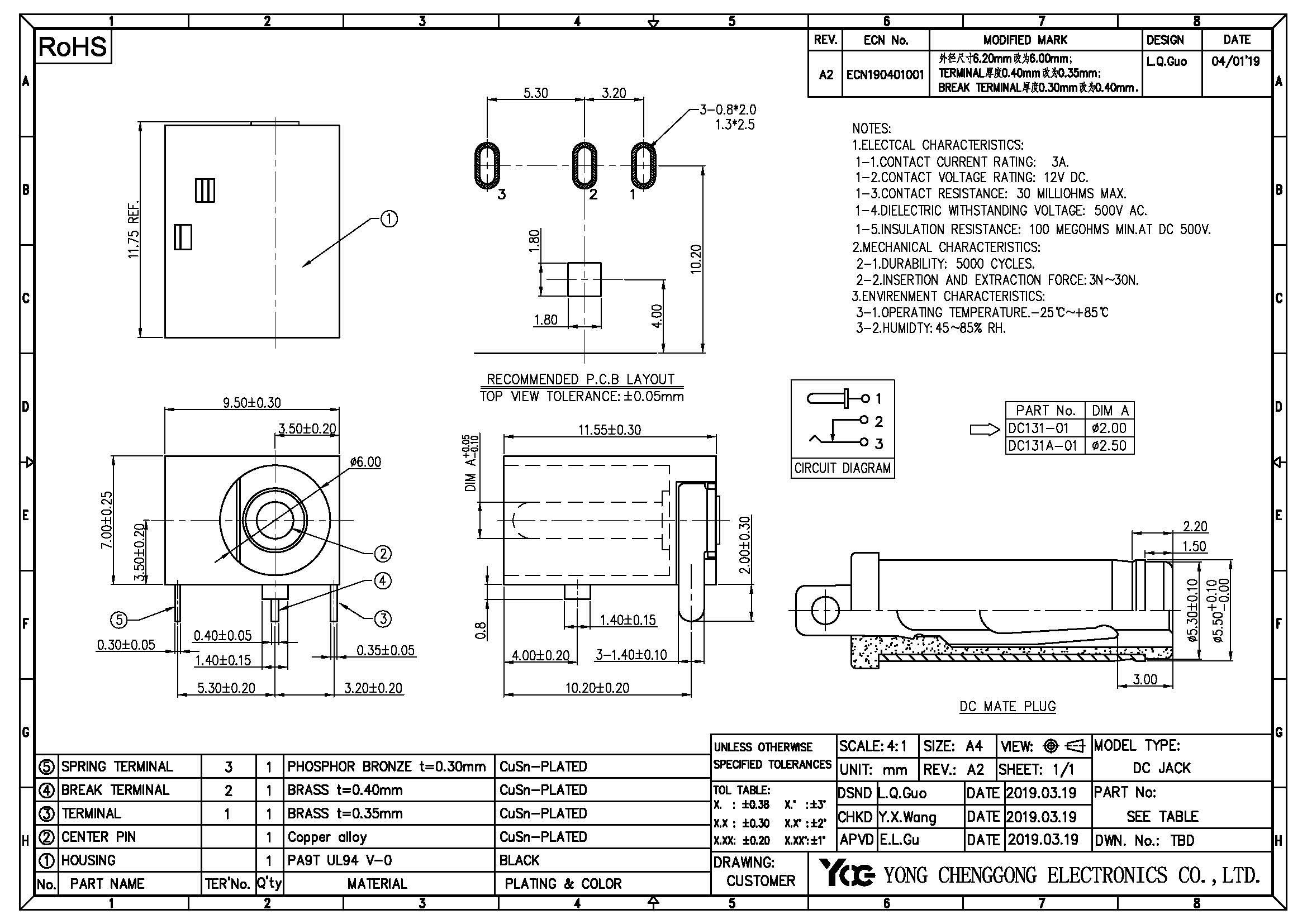 DC131 DC POWER JACK,φ2.00mm,φ2.50mm,R/A DIP