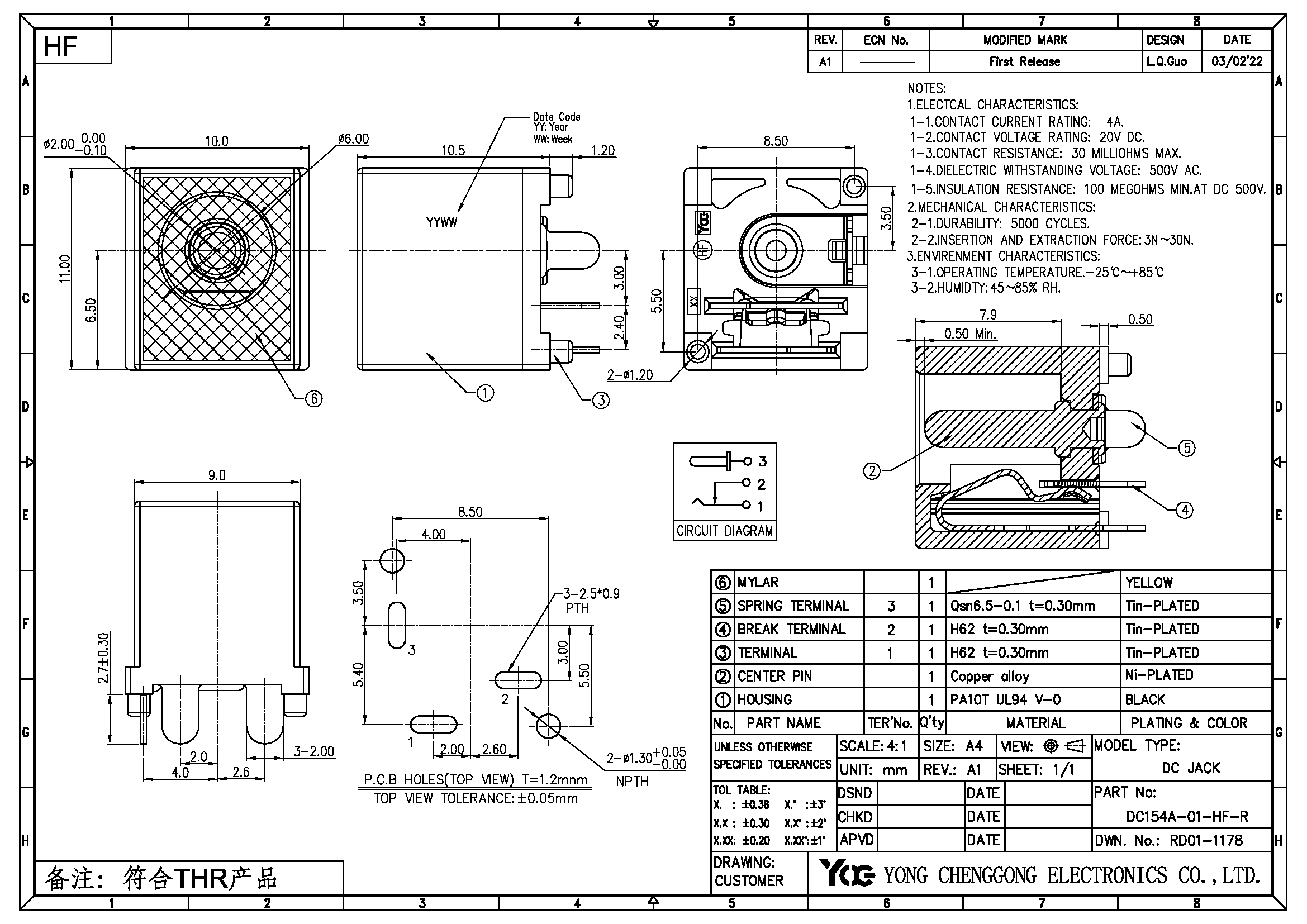 DC154 DC POWER JACK,φ2.0mm, V/T PIP