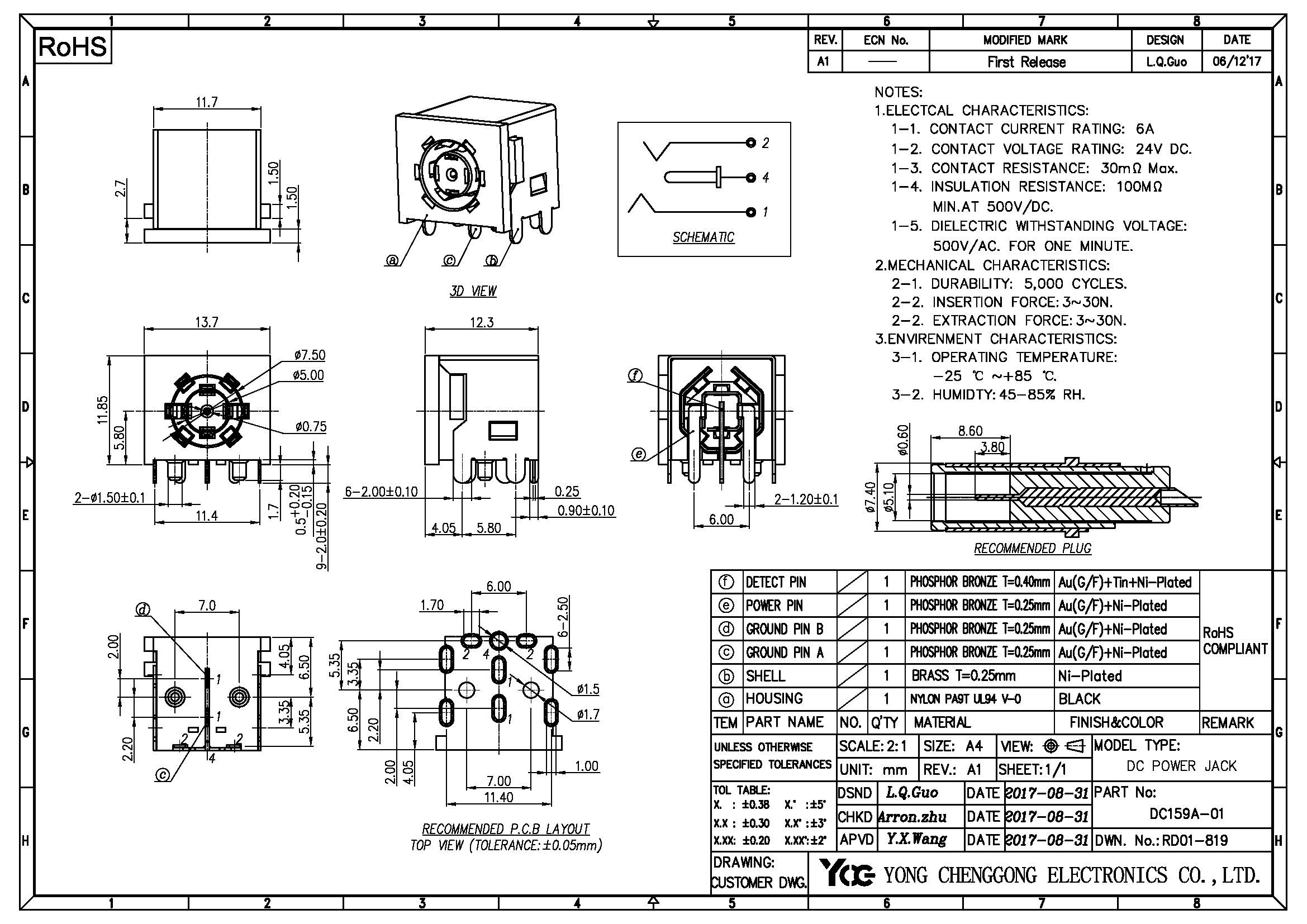 DC159 DC POWER JACK,φ0.75mm, R/A DIP WITH SHELL