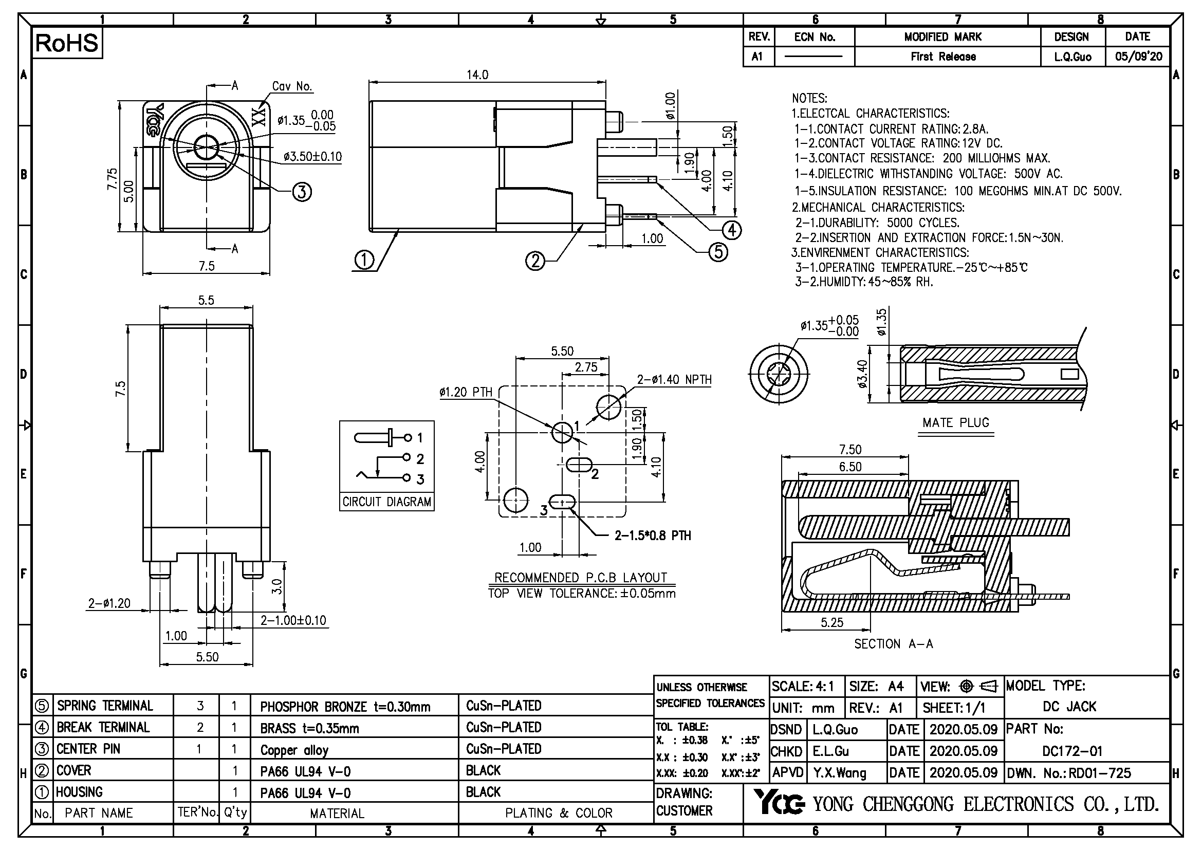 DC172 DC POWER JACK,φ1.35mm, V/T DIP