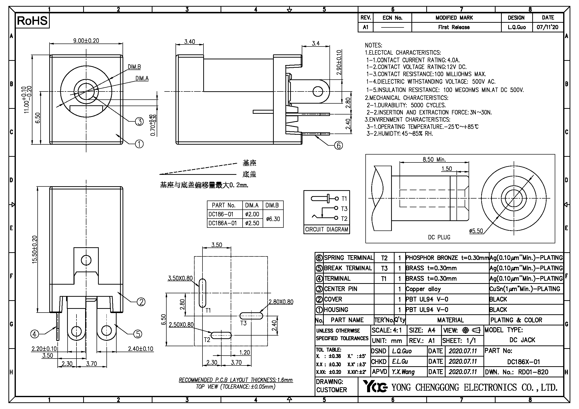 DC186 DC POWER JACK,φ2.5mm, V/T DIP