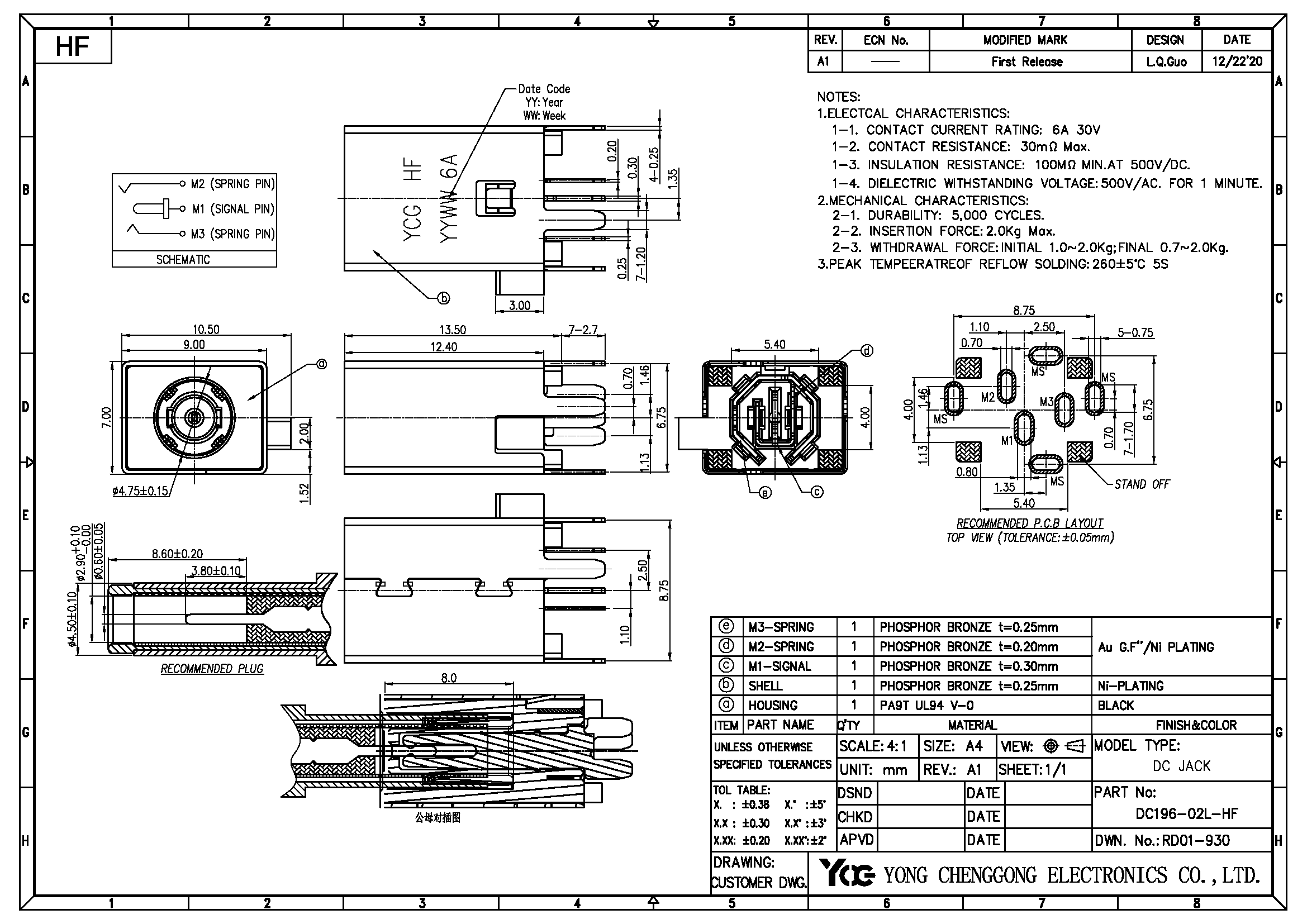 DC196 DC POWER JACK,φ0.75mm, V/T DIP WITH SHELL