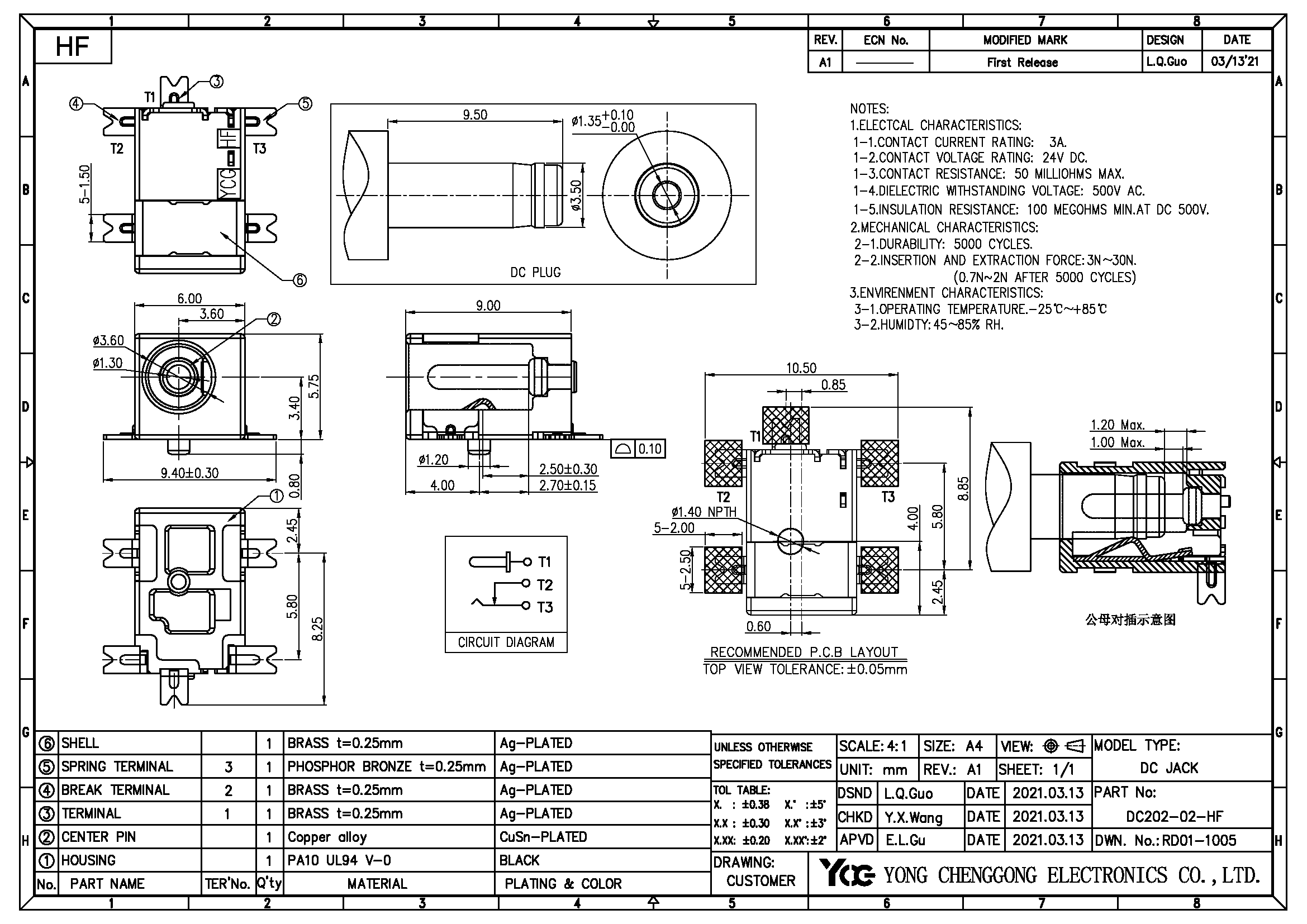 DC202 DC POWER JACK,φ1.3mm, R/A DIP WITH SHELL