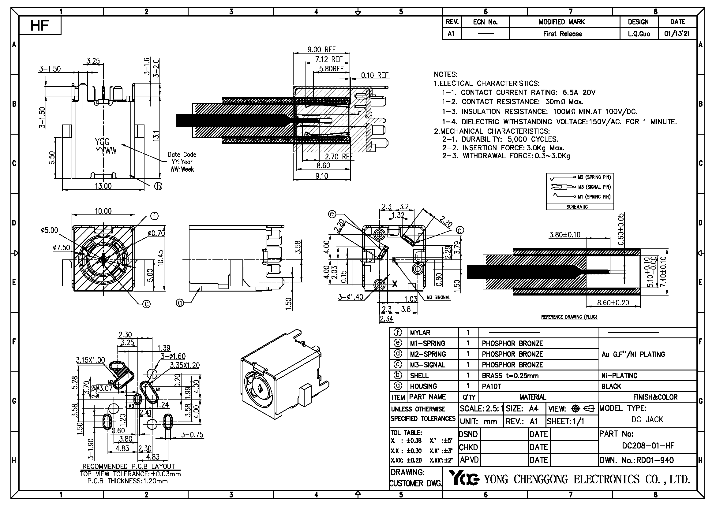 DC208 DC POWER JACK,φ0.75mm, V/T DIP WITH SHELL