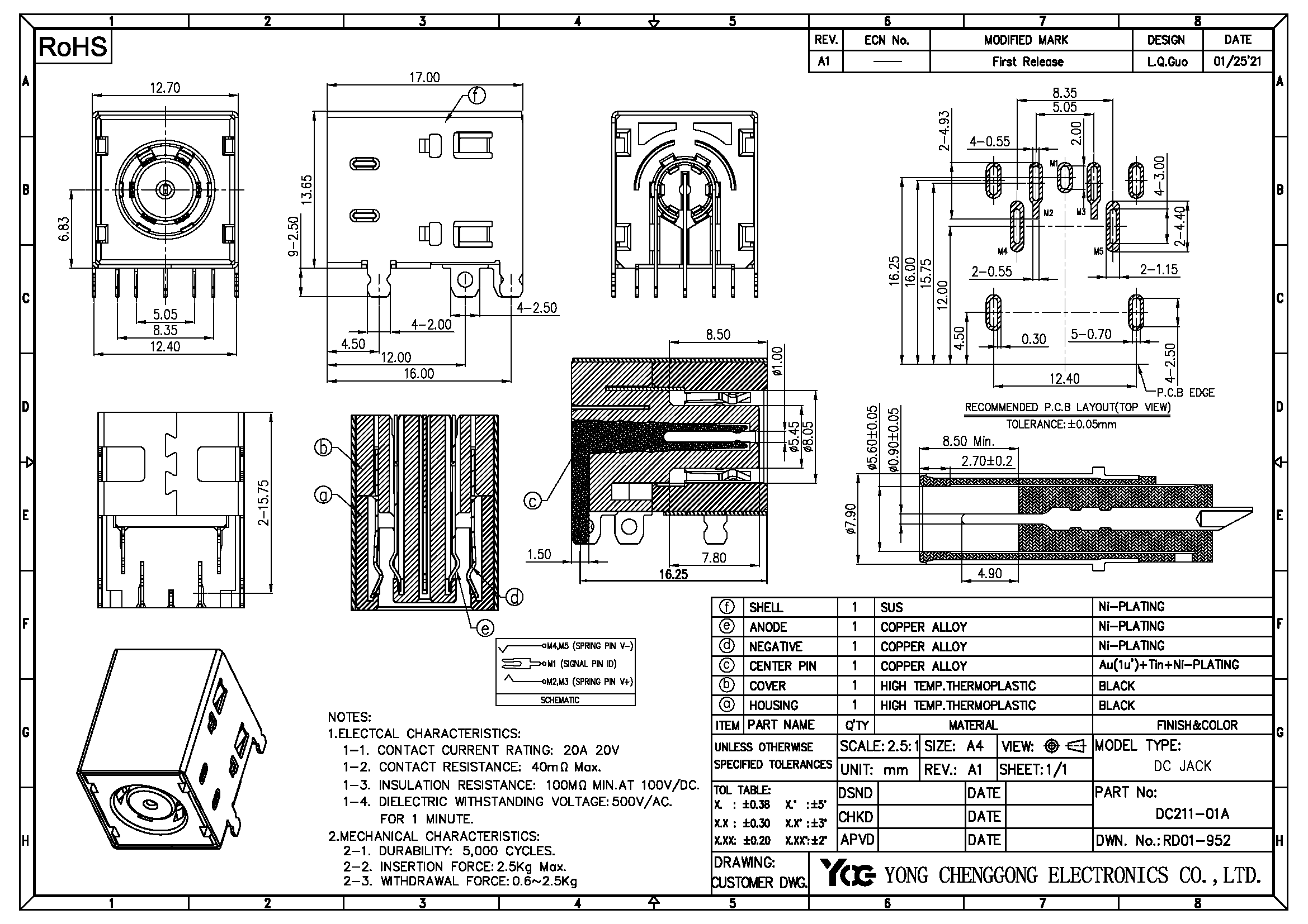 DC211 DC POWER JACK,φ0.75mm, R/A DIP WITH SHELL