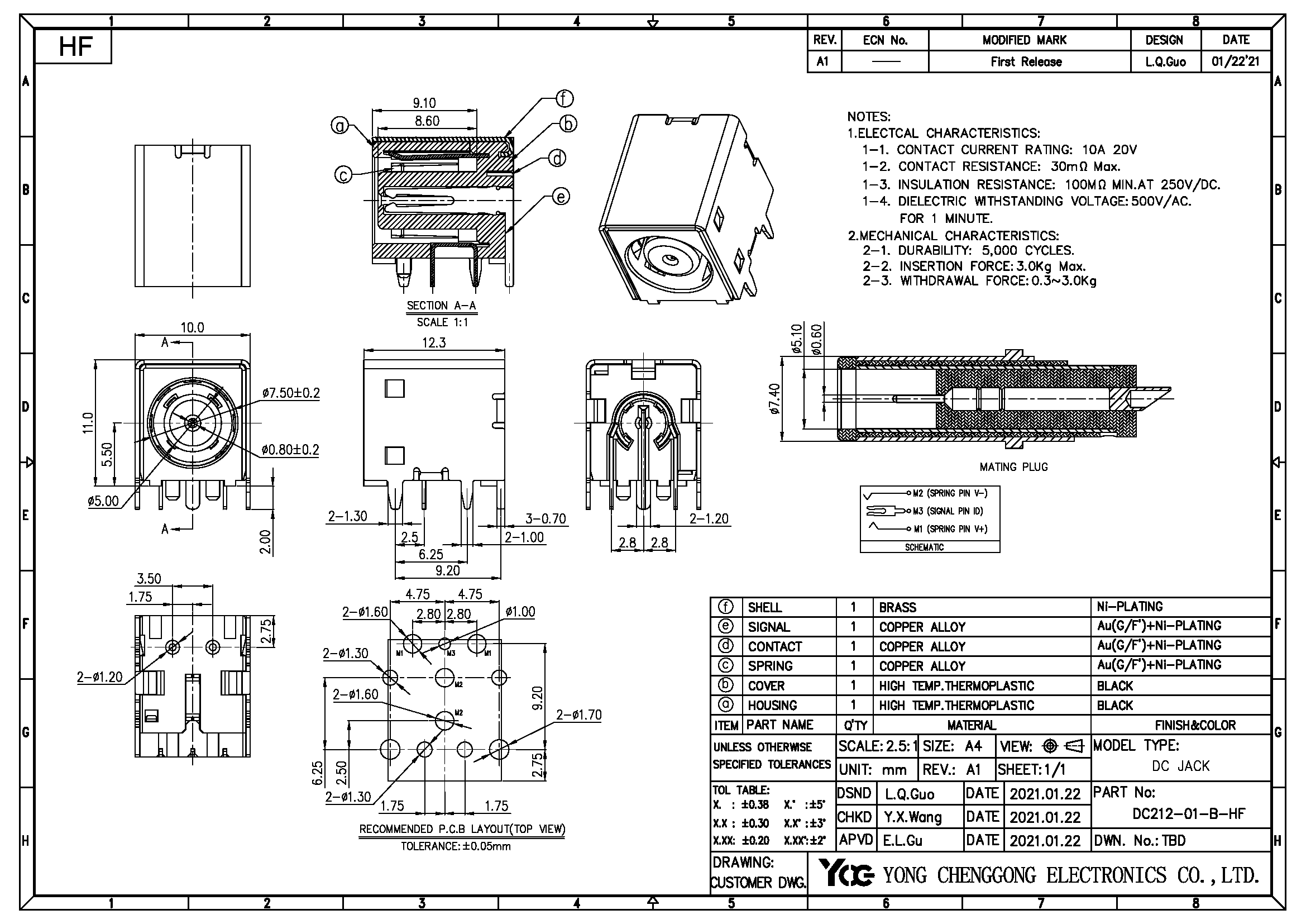 DC212 DC POWER JACK,φ0.75mm, R/A DIP WITH SHELL