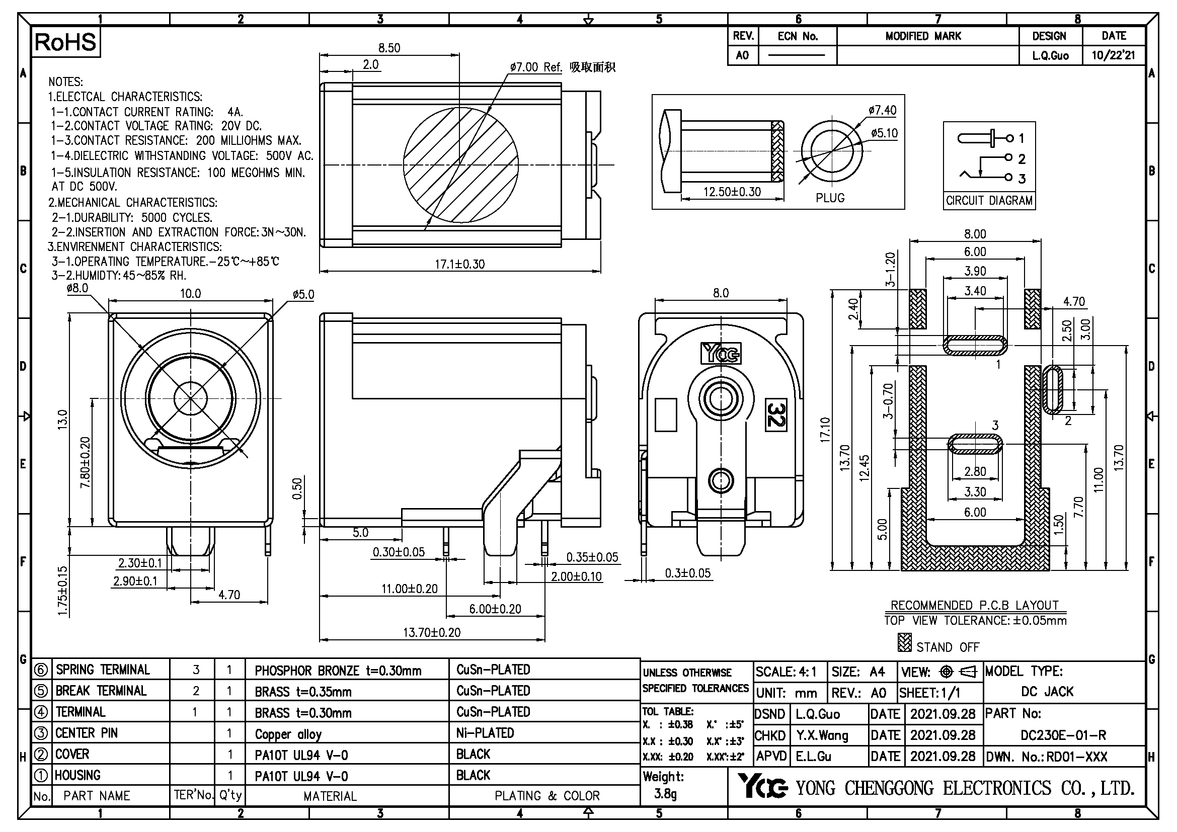 DC230 DC POWER JACK,φ5.0mm,R/A PIP