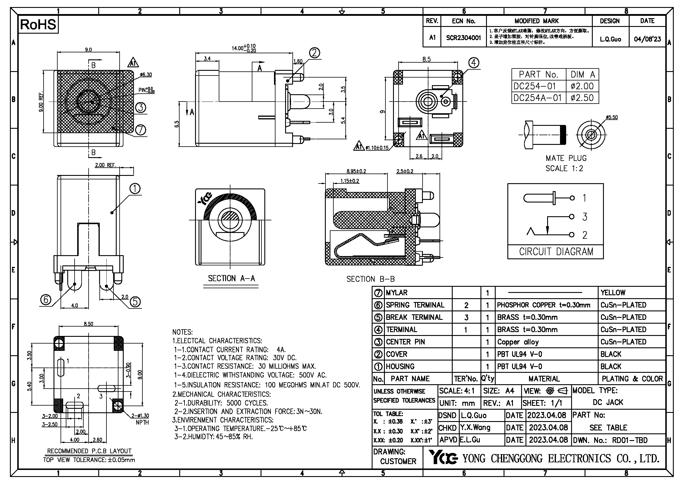 DC254 DC POWER JACK,φ2.0mm,V/T DIP