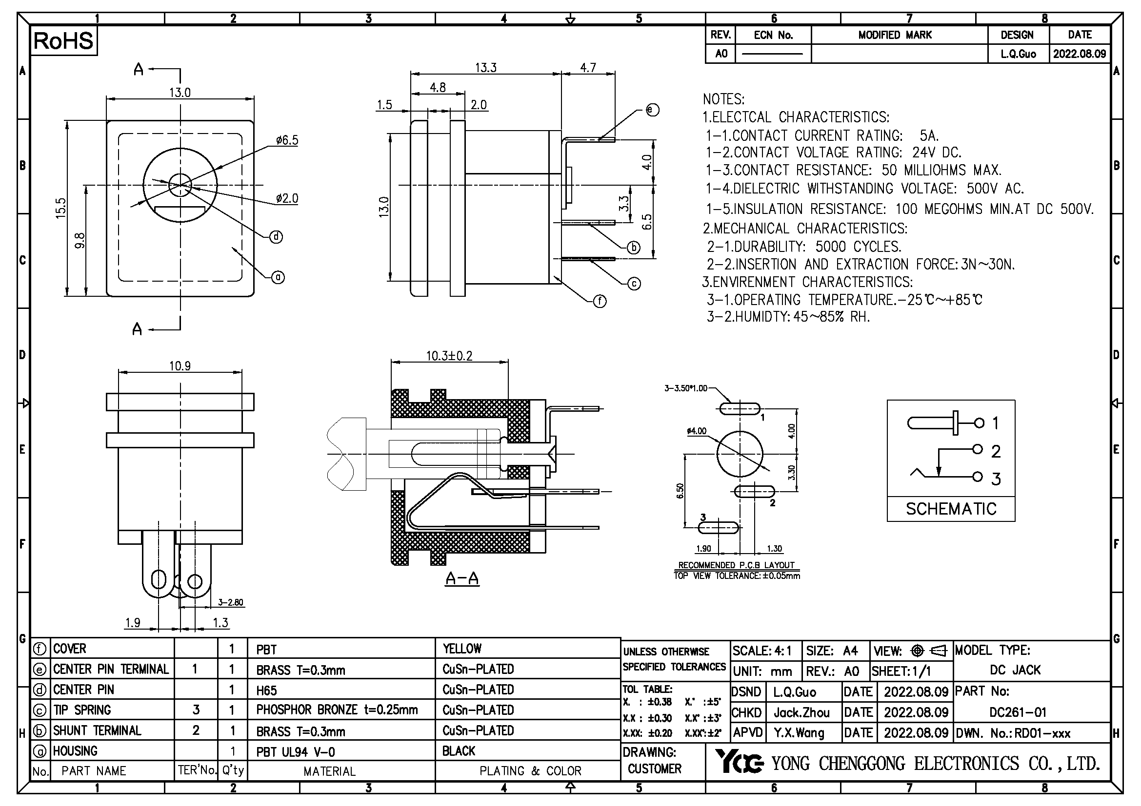 DC261 DC POWER JACK,φ2.0mm,V/T DIP