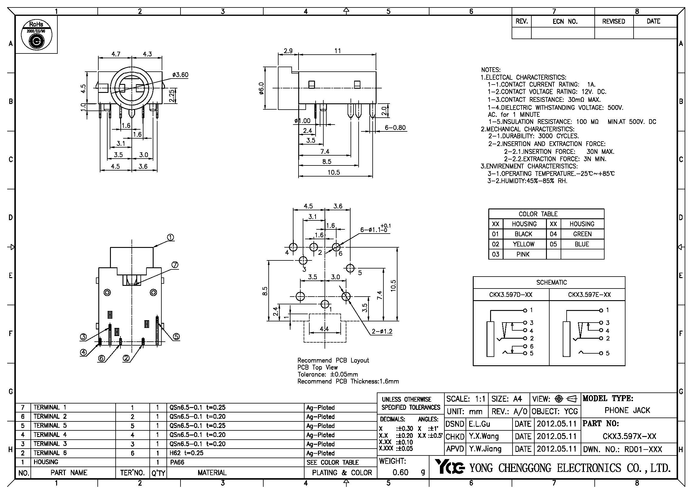 CKX3.597 PHONE JACK φ3.6mm,R/D,CH2.25mm,3 Poles,BLACK&YELLOW&PINK