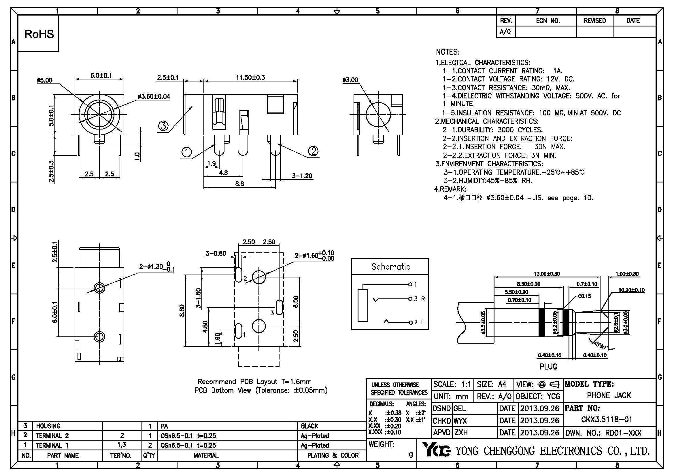 CKX3.5118 PHONE JACK φ3.6mm,R/D,CH.2.5mm,3 Poles,BLACK