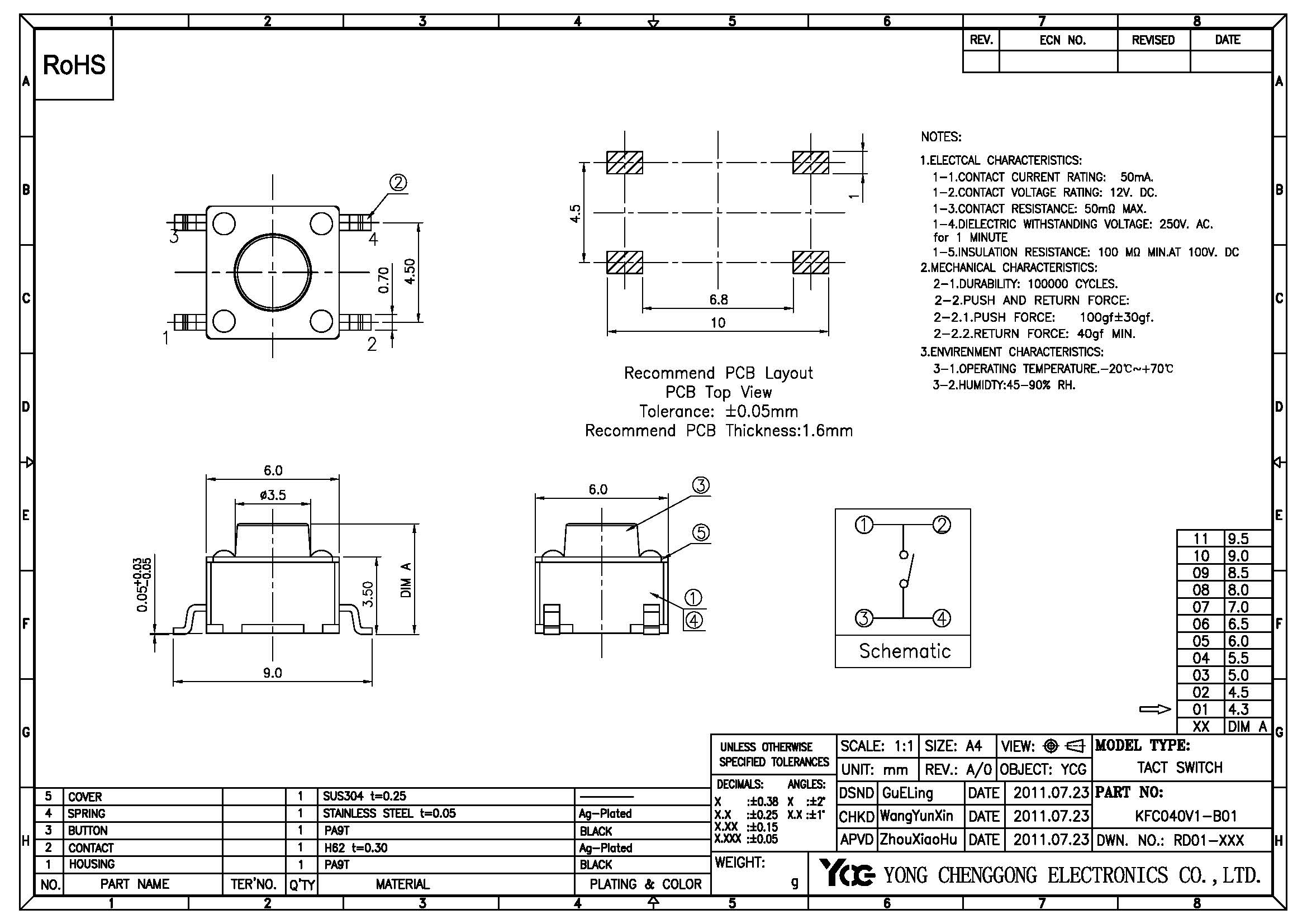 KFC040 TACT SWITCH V/S,H4.3mm~H9.5,160gf/260gf±50gf,Black