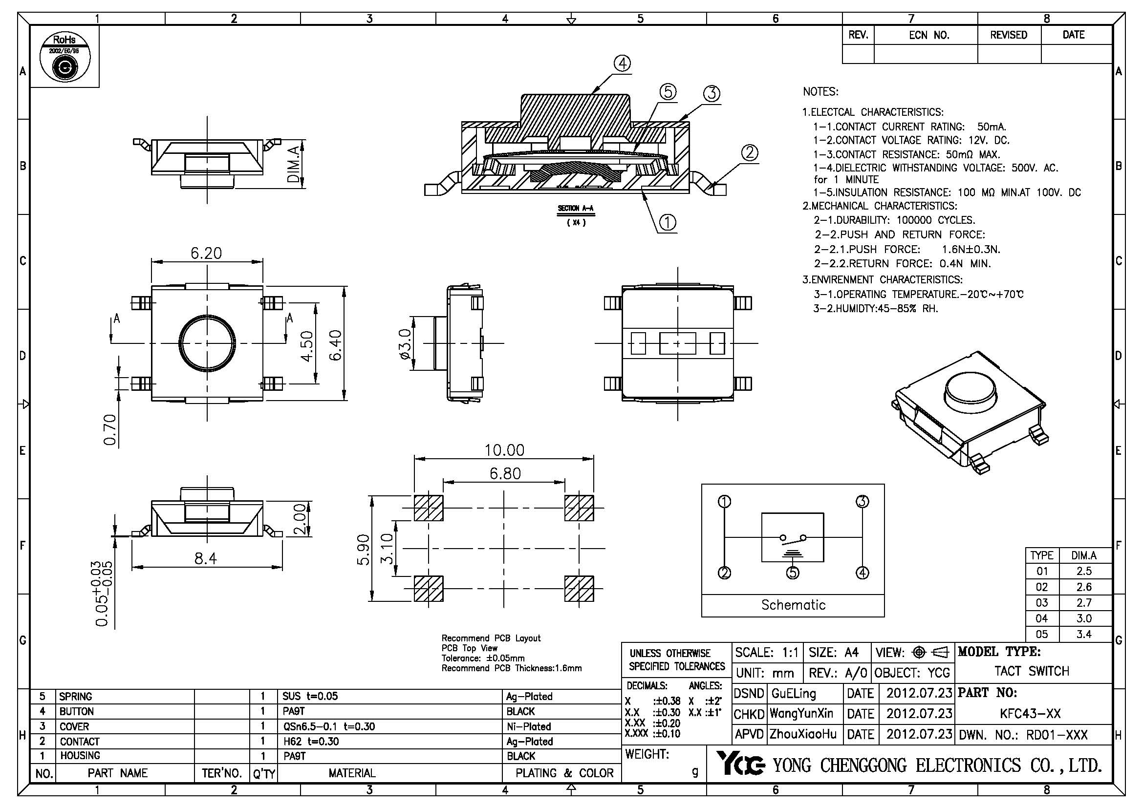 KFC43 TACT SWITCH V/S,L6.4*W6.4*H2.5,160gf/260gf±50gf,Black