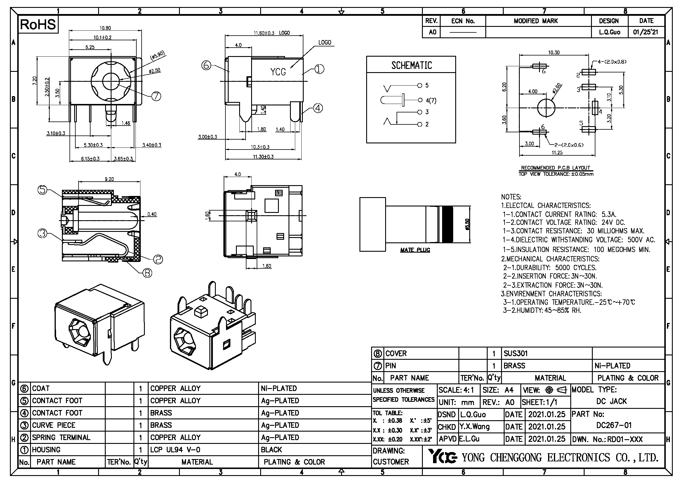 DC POWER JACK,φ2.5mm,R/A DIP WITH SHELL