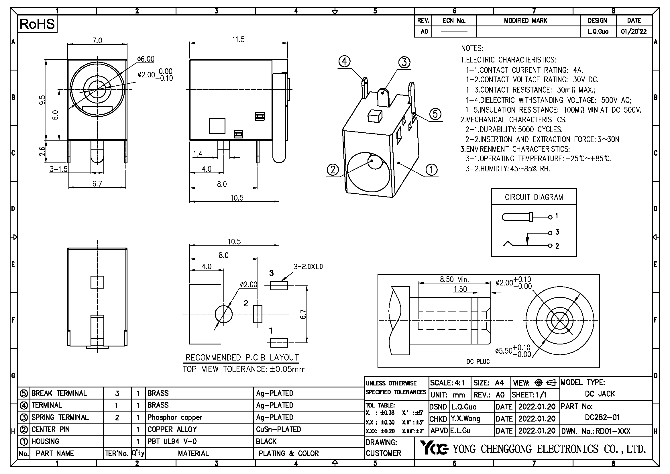 DC POWER JACK,φ2.0mm,R/A DIP