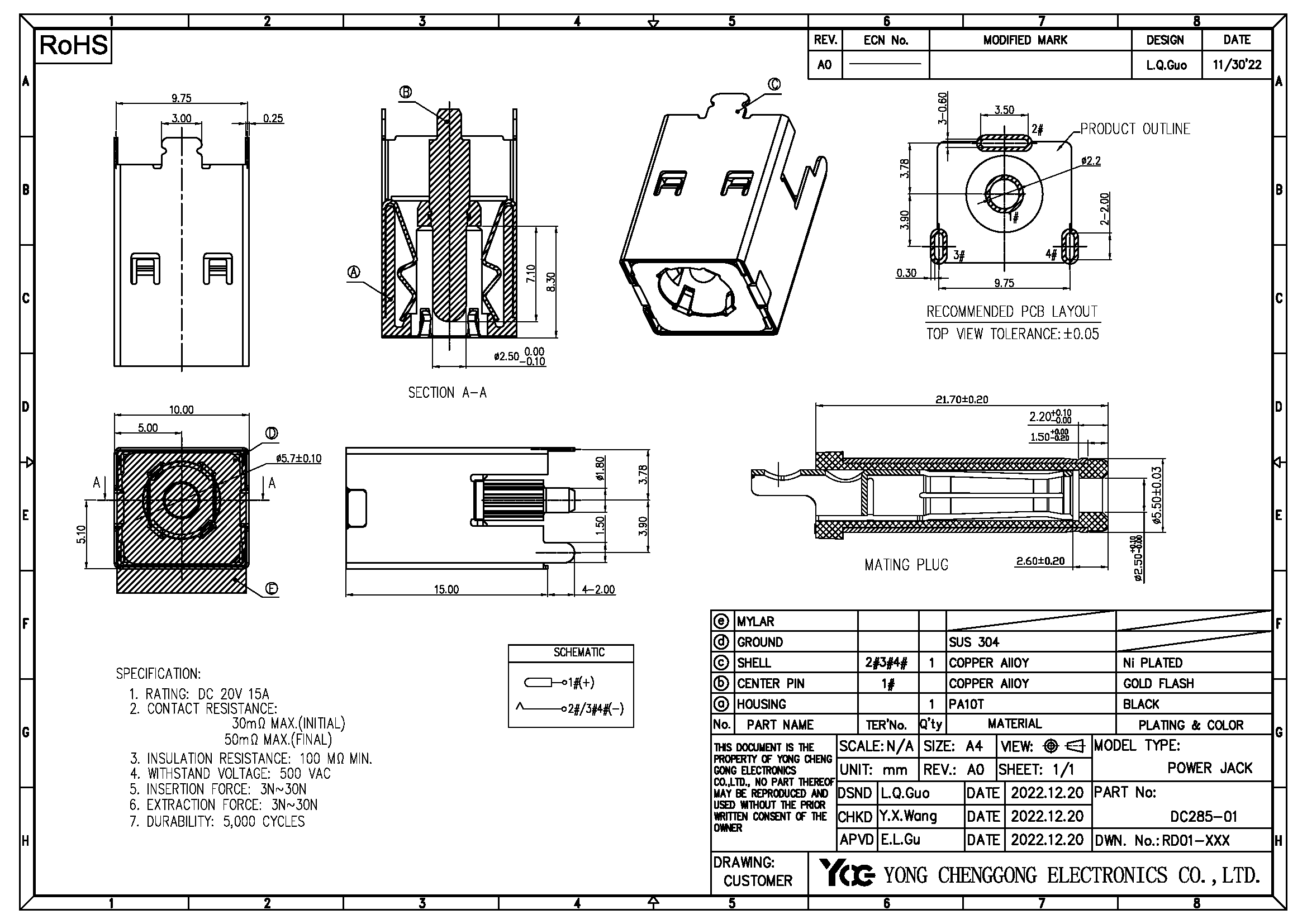 DC POWER JACK,φ2.0mm,V/T DIP WITH SHELL