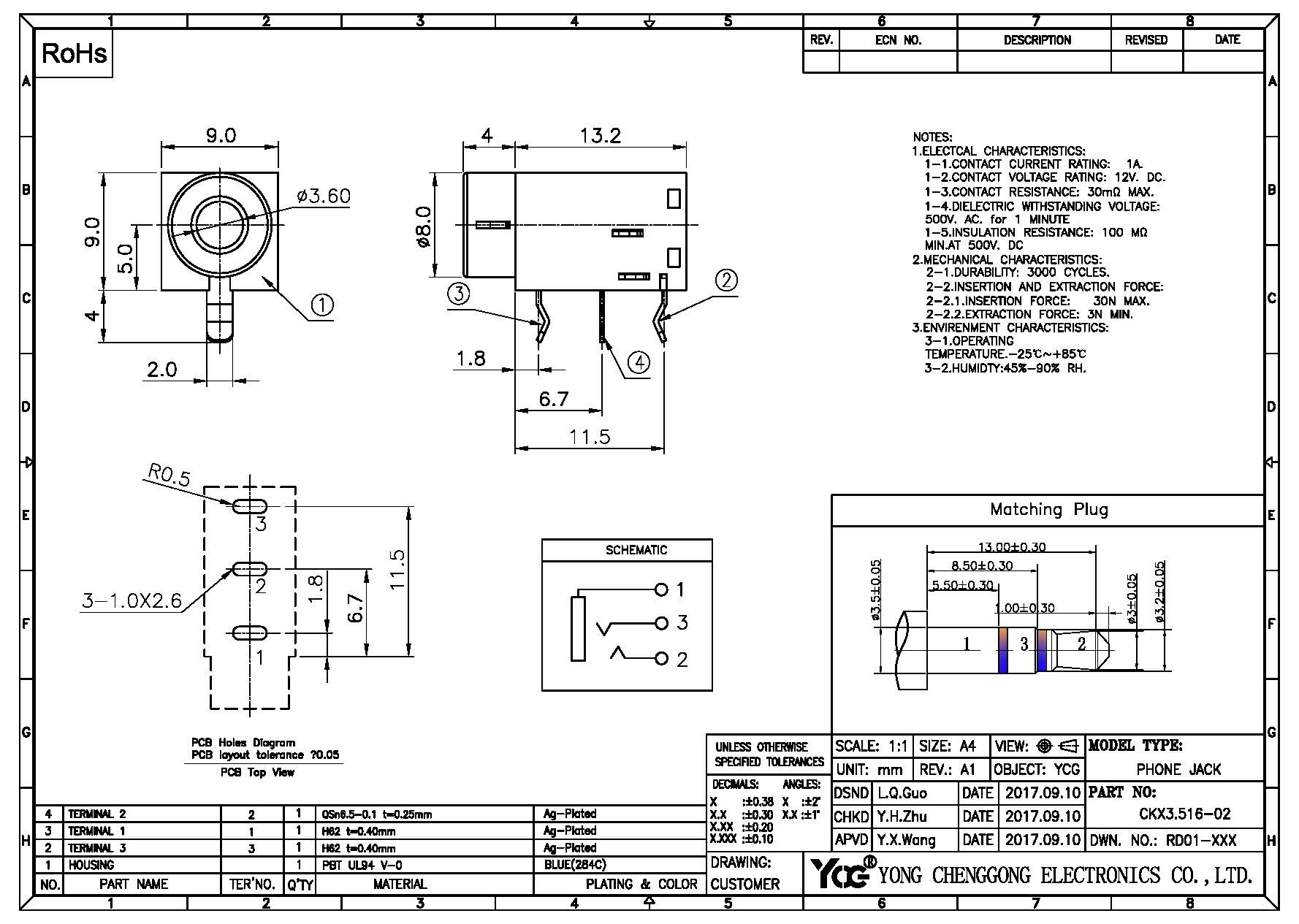 PHONE JACK φ3.6mm,R/A,CH5.0mm,3 Poles DIP,BLACK