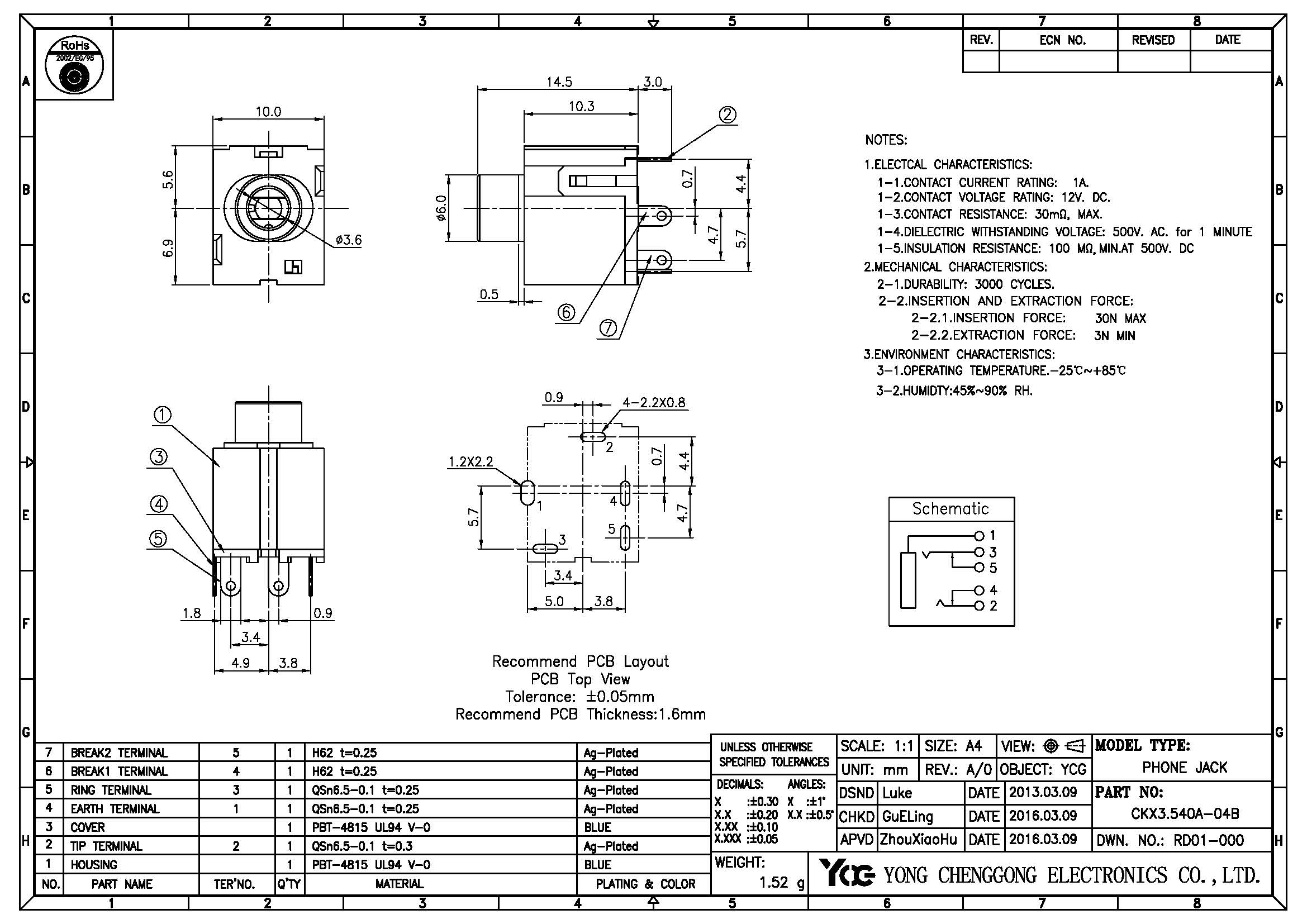 PHONE JACK φ3.6mm,V/D,H10.3mm,3 Poles