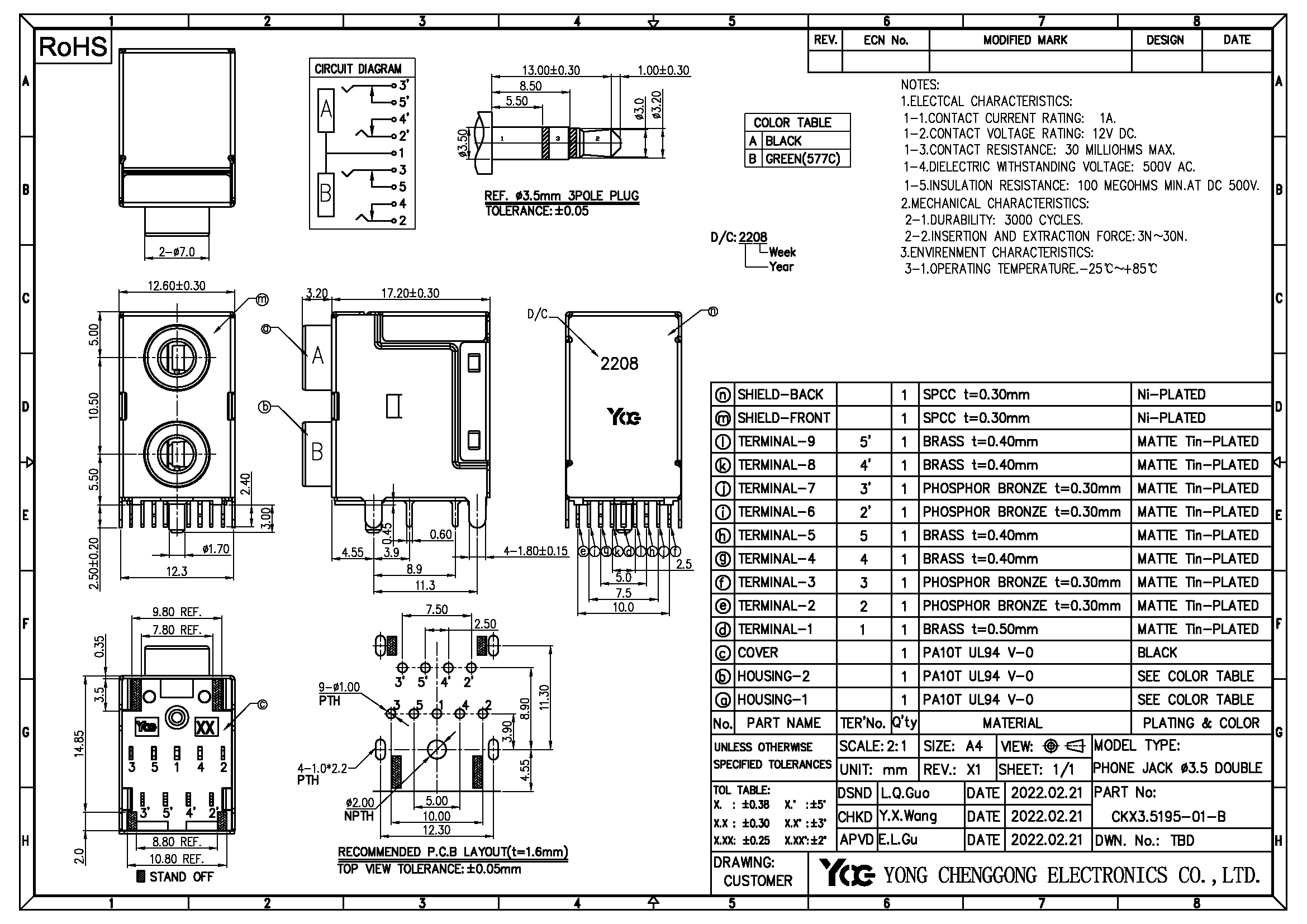 PHONE JACK φ3.6mm,R/S,3 Poles,BLACK