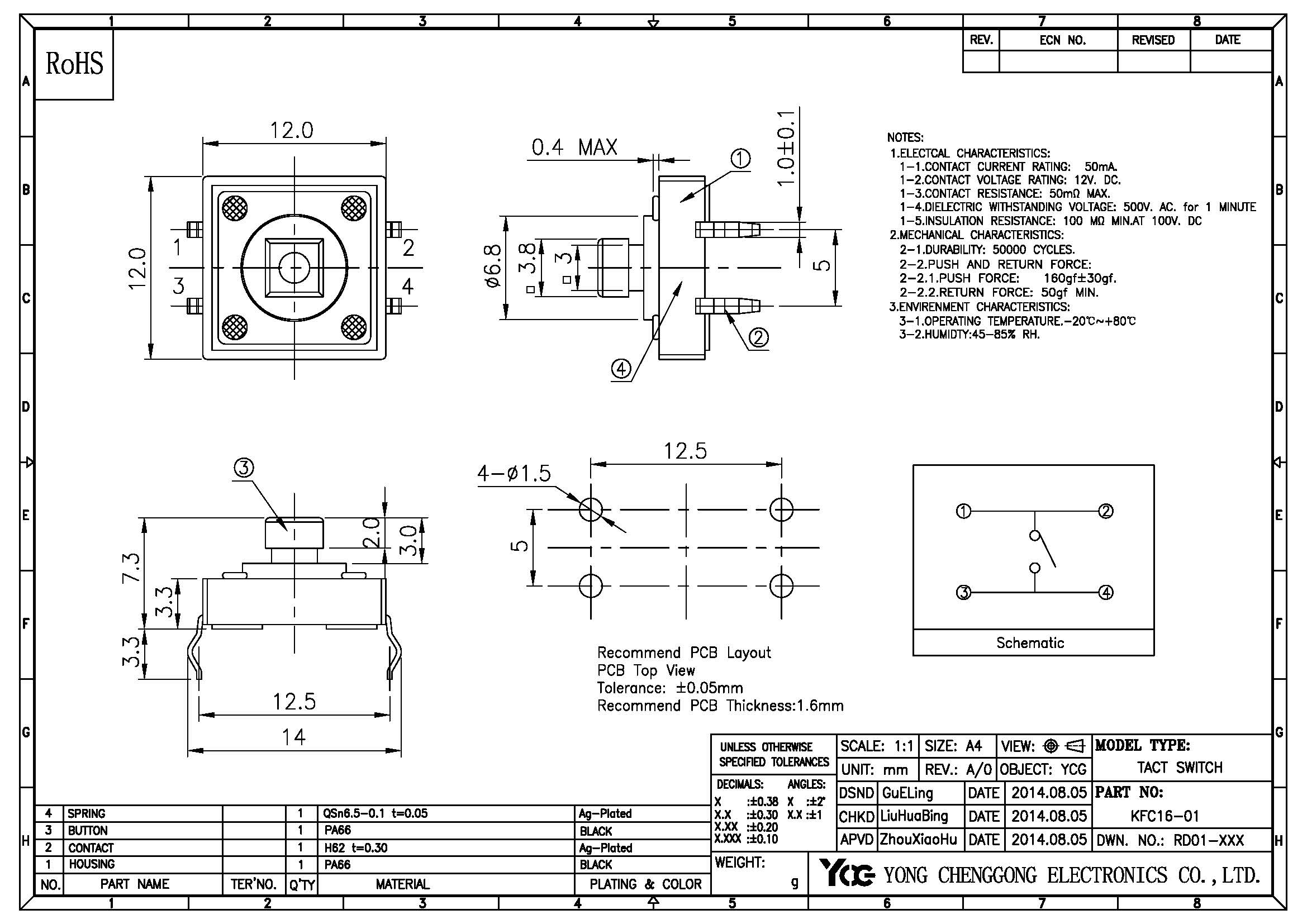 TACT SWITCH 12*12*7.3 V/D,160gf
