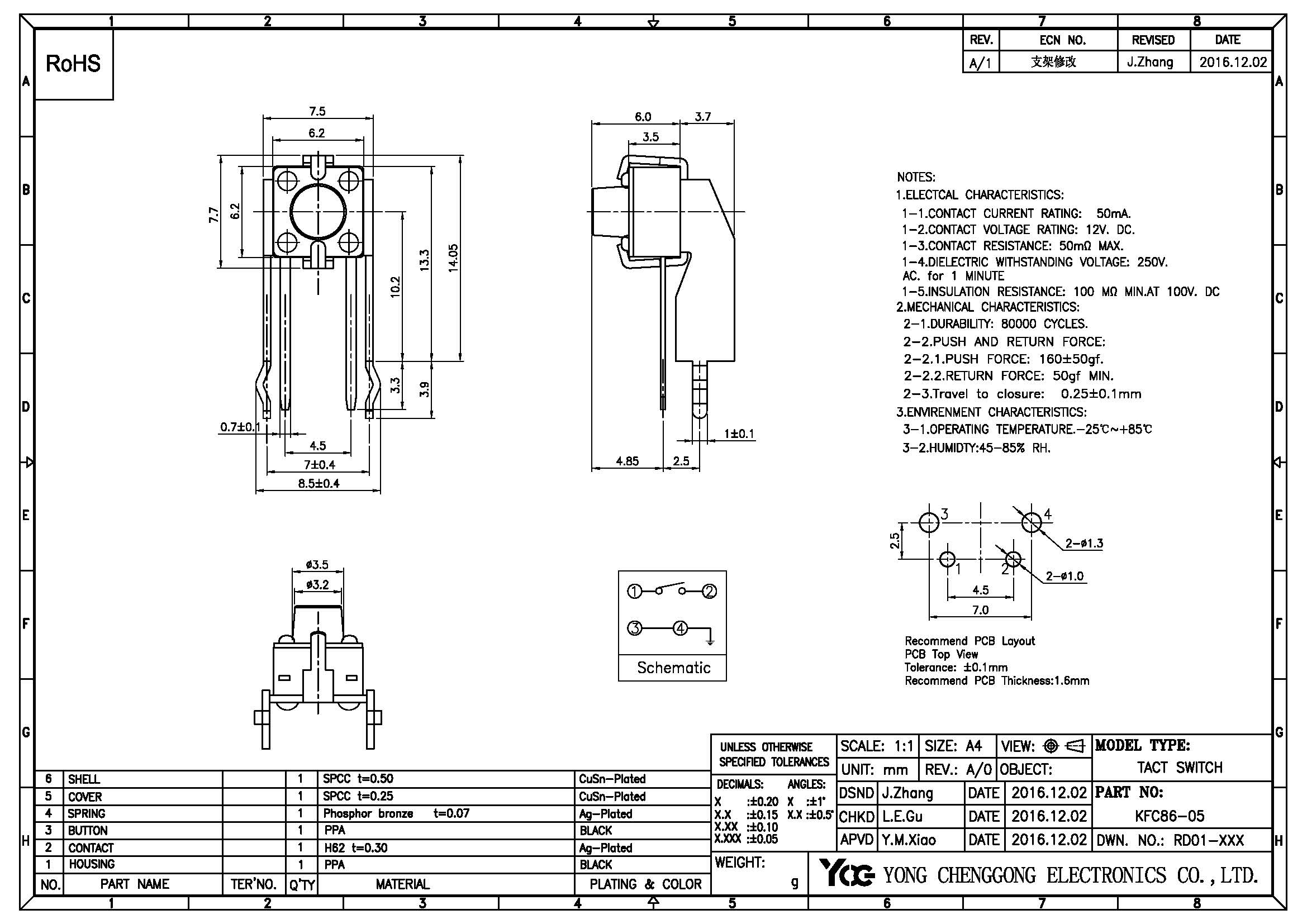 TACT SWITCH R/D,CH=10.2mm,160gf±50gf