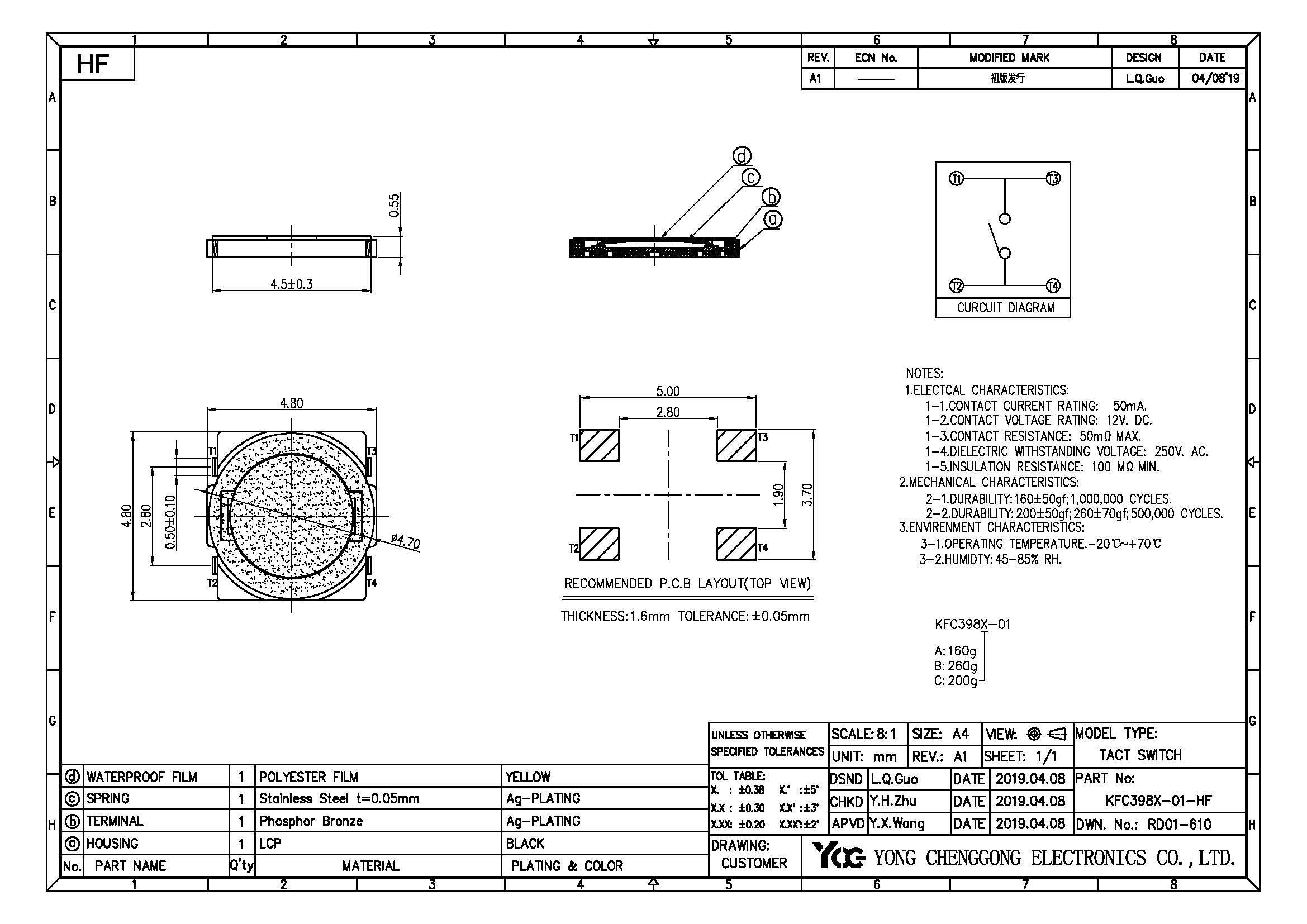 TACT SWITCH V/S,L4.8*W4.8*H0.55,160gf/250gf±50gf